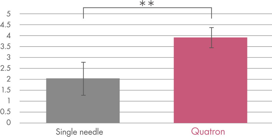 Bei Quatron handelt es sich um einen Spritzenaufsatz mit 4 längenverstellbaren Nadeln, der im rechten Winkel auf die Haut aufgesetzt wird. Durch die festgelegte Länge der Nadeln und das senkrechte Aufsetzen befindet sich die behandelnde Person quasi immer in der gewünschten Tiefe. Ein weiterer Vorteil ist die Anzahl der Nadeln. Sie sorgt dafür, dass sich der Wirkstoff wesentlich besser im Gewebe verteilt und dabei gleichzeitig weniger Druck für die Injektion nötig ist. Quatron wurde entwickelt, um Ärzten und Heilpraktikern bei der Injektion mehr Stabilität und Sicherheit zu geben. Es gelingt, sauberer, sicherer und schneller zu arbeiten.